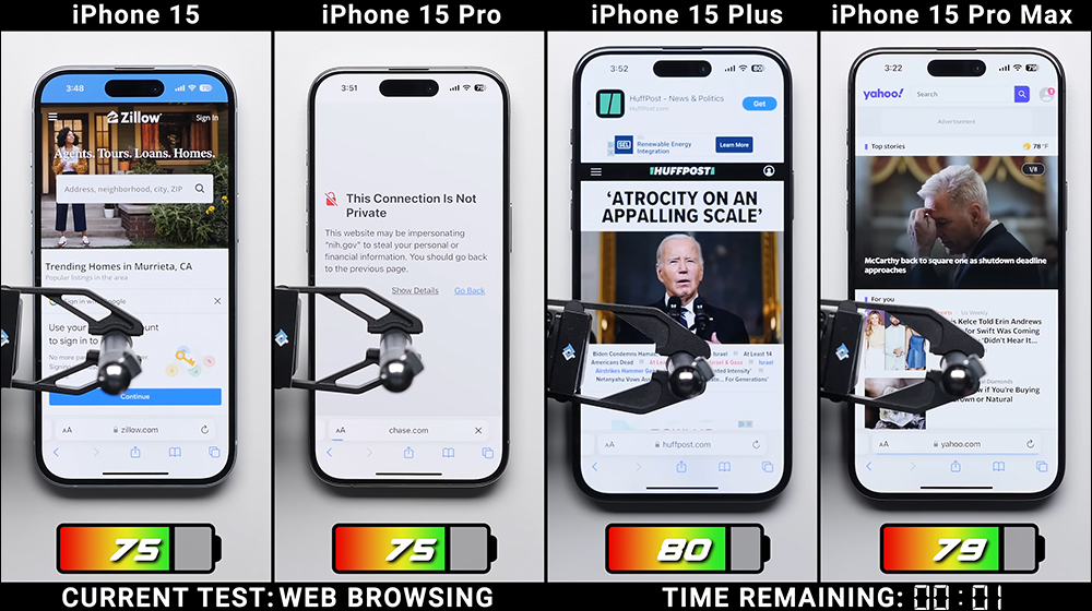 國外 YouTube 頻道 PhoneBuff 經常會幫大家測試 iPhone 和其他代表性 Android 手機的電池續航表現,以機器人操作測試手機同時執行相同的 App 耗電情況。這次,以 iPhone 15、iPhone 15 Pro、iPhone 15 Plus 以及 iPhone 15 Pro Max 的 iPhone 15 全系列電池續航大 PK。首先第一輪測試,同時讓這四款 iPhone 通話 1 小時。