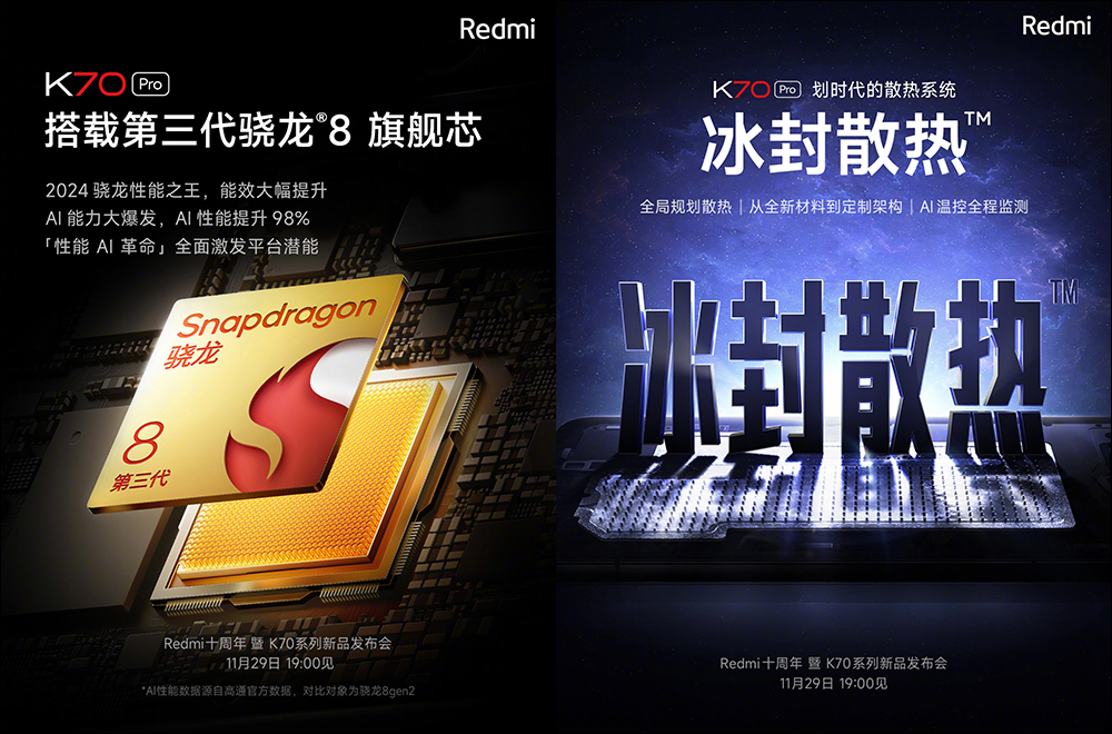 日前 Redmi 宣布 Redmi K70 Pro 將搭載高通 Snapdragon 8 Gen 3 旗艦行動平台,同時也搭載全新的「冰封散熱」系統,包括全面規劃的散熱系統解決方案、自研新一代散熱材料。此外, Redmi K70 Pro 還配備 AI 溫控全程監測功能等。