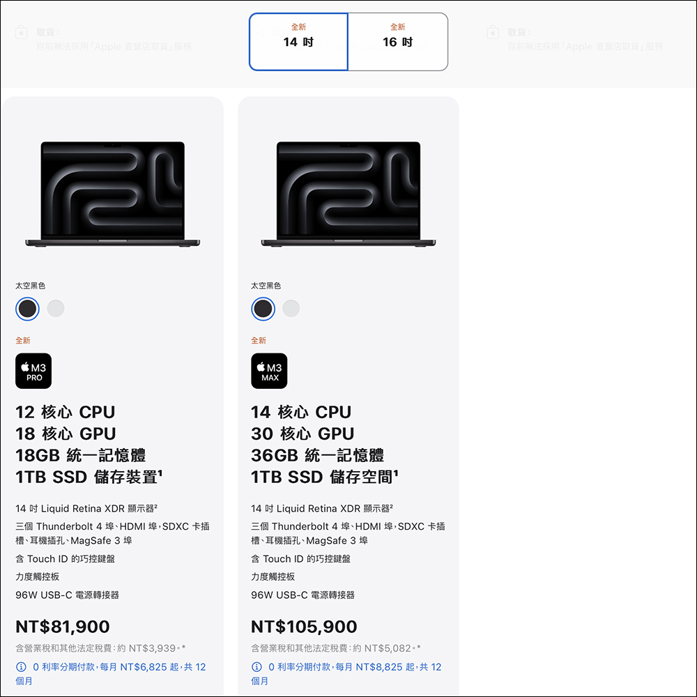 隨著 M3 系列晶片推出後, Apple 也終於將 13 吋 MacBook Pro 下架。目前最小的 MacBook Pro 就已經是直接升級 14 吋的 MacBook Pro ,搭載標準版的 M3 MacBook Pro。但要特別留意,如果要選擇全新的「太空黑色」,必須至少選到 M3 Pro 或升級 M3 Max 才有太空黑色(另有銀色可選),否則選擇標準版 M3 晶片則提供太空灰色和銀色兩種選擇。
