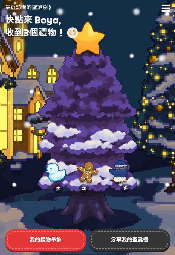 大家只要點擊「分享我的聖誕樹」並複製連結傳給朋友,朋友就可以幫你掛上禮物。(要使用網頁開啟,不然無法使用)
