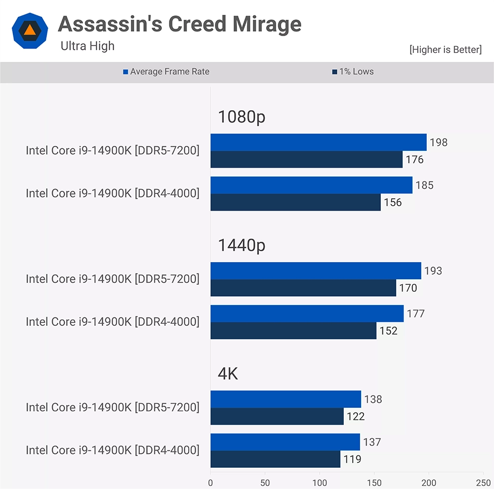 首先是《刺客教條:幻象》,1080p 和 1440p 的解析度中,DDR5 的優勢比較明顯,都領約大約 10% 左右,但來到 4K 之後,DDR5 和 DDR4 就差不多:
