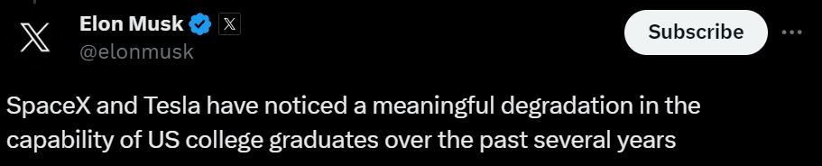 這也不是伊隆·馬斯克第一次創辦自己的學校,2014 年伊隆·馬斯克為自己的孩子和公司員工的子女創辦一所沒有學習制度只專注於培養才能和能力的小型私立學校” Ad Astra “。這次伊隆·馬斯克向慈善機構捐贈 1 億美金用於創辦學校的原因可能跟他在推特上發表的言論有關,他在 12 月 11 日寫到「SpaceX and Tesla have noticed a meaningful degradation in the capability of US college graduates over the past several years(在過去這幾年來,SpaceX 和 Tesla 注意到美國大學畢業生的能力有了明顯的下降。)」