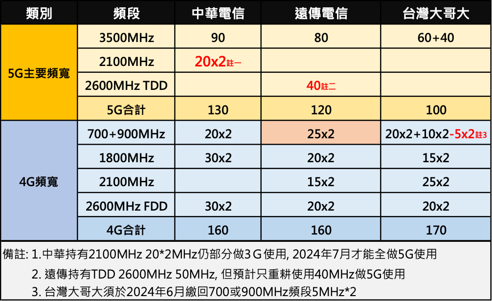 另外,針對室內涵蓋最佳與戶外涵蓋最遠的4G低頻頻段部分,因4G LTE最大可用頻寬只有20MHz,所以台灣大哥大與遠傳電信持有700MHz頻段在可用頻寬其實是一樣的,持有25MHz並不會優於20MHz!