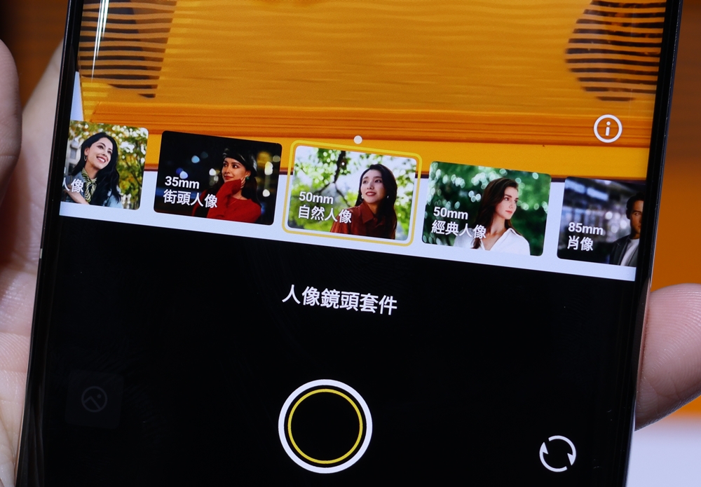 蔡司全焦段人像大師的使用方式是這樣的,切換到人像模式之後,在介面右側會出現一個小小的鏡頭符號,點下去就會出現人像鏡頭套件,每個焦段都對應好一種不同的散景效果,搭配專屬該焦段的色調,很能創作出時尚照片感。