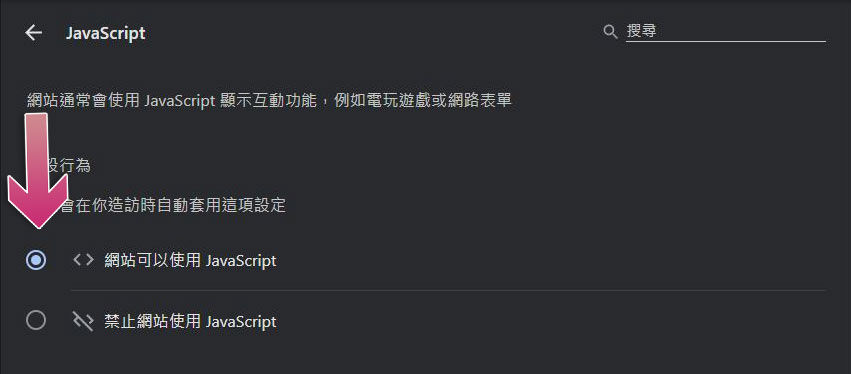 - 確保已經選擇「網站可以使用 JavaScript」。