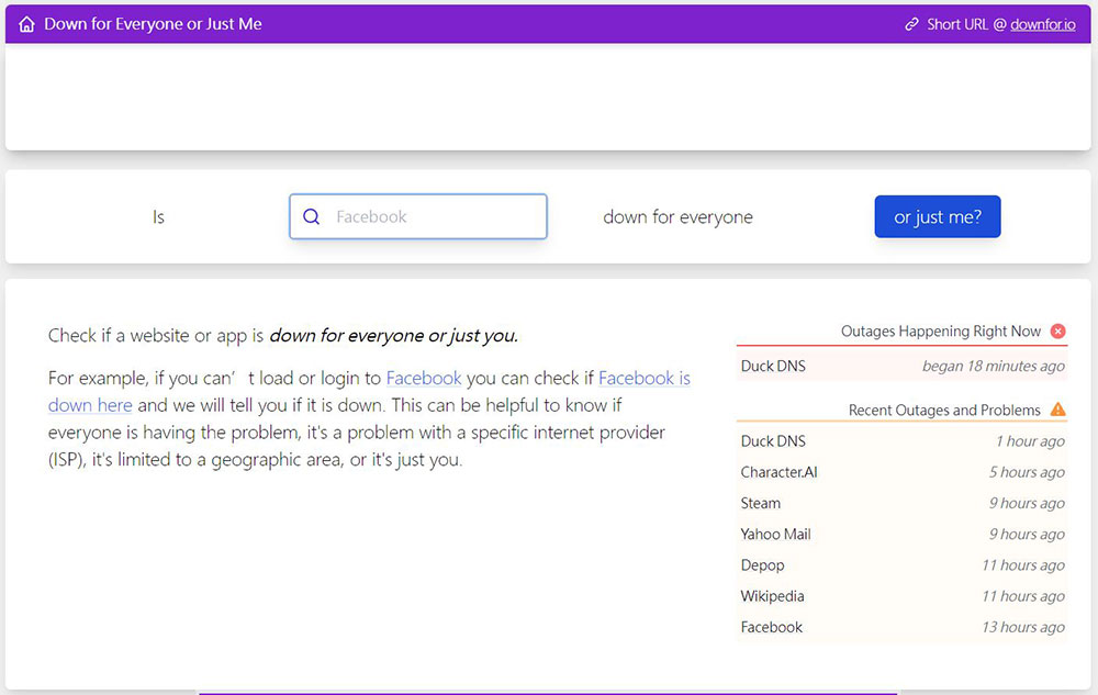 如果圖像在其他網站上可以成功載入,僅在特定網站上出現載入異常的問題,則根本原因可能就出在該網站上,如果是這種情況,請確保網站服務正常無關必。請使用像是 Down for Everyone or Just Me 服務檢查,在搜尋欄位中輸入特定網站 URL 後按下 Enter(或是點擊後面的 or Just Me 按鈕)。