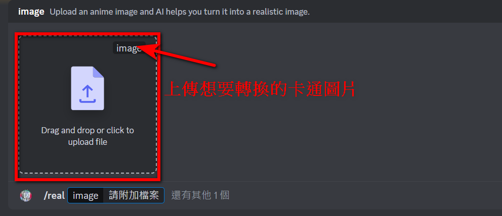 再跟大家介紹「DomoAI」的另一個功能,將動漫圖片轉換成真人照片。輸入框輸入「/real」,點擊紅色框框的選項。