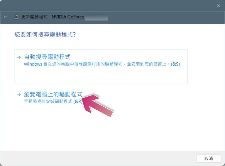 • 選擇「瀏覽電腦上的驅動程式」,選取你已經下載好的最新版驅動即可開始進行安裝。