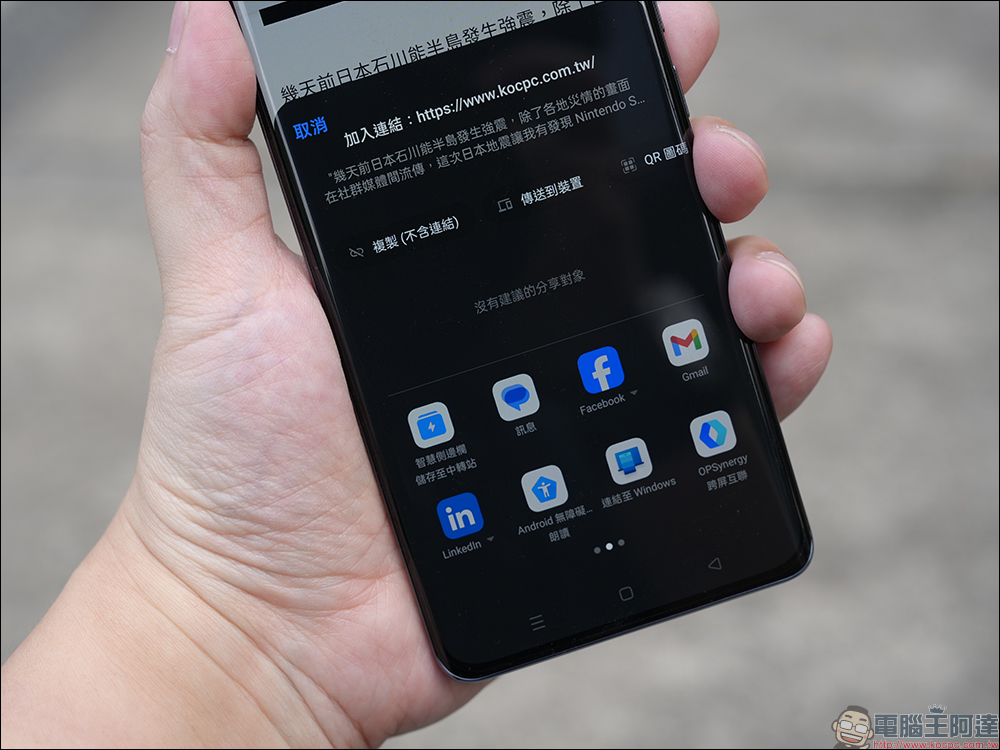 選取文字、圖片或連結後,除了拖曳至資訊中轉站,也可點選「分享」將它傳送到資訊中轉站保存。