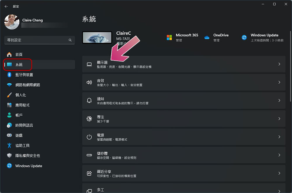 - 打開「設定」應用程式,點擊左側邊欄的「系統」,然後選擇「顯示器」。