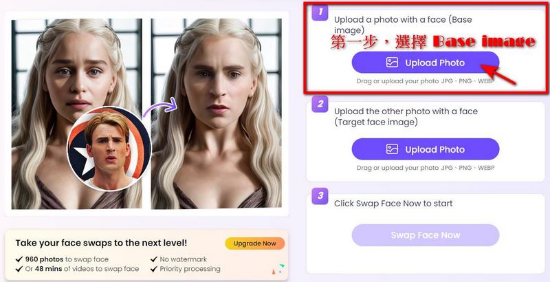 進入網站之後出現這個畫面就可以開始進行換臉,換臉只有三個步驟。! 注意 ! 圖片換臉一天只有 8 張免費扣打,超過就需要花錢。