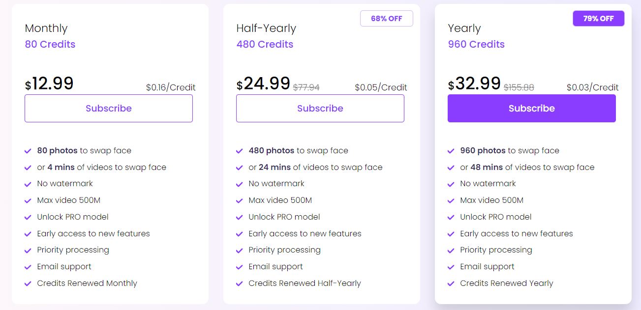 最後附上 Vidnoz 的 AI Face Swap 功能的會員金額,月會員 12.99 美金(約 404 台幣)、半年會員 24.99 美金(約 778 台幣)、年會員 32.99 美金(約 1027 台幣)。不過每天有 8 張免費圖片換臉和 2 次影片換臉的額度,大家可以斟酌購買。