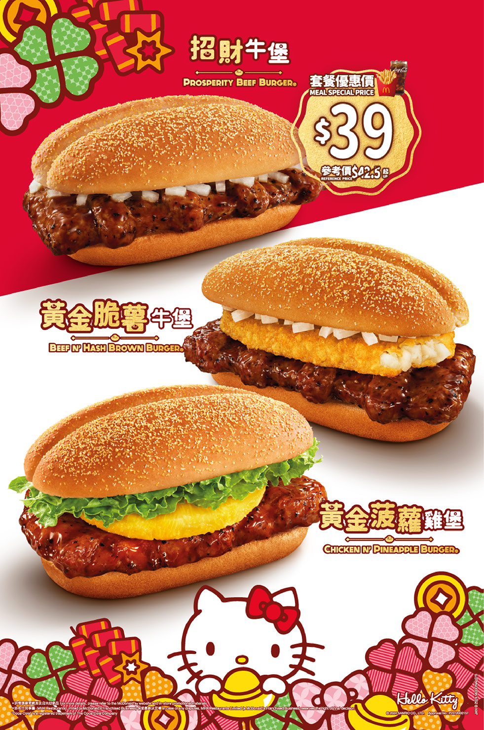 台灣麥當勞於 2024 年 1 月 17 日推出每年農曆春節必出的「金迎招財」系列漢堡,今年推出厚實牛肉 or 雞肉配上黑胡椒醬和金黃薯餅的金迎招財福堡(牛/雞)、金迎招財薯來堡(牛/雞),期間限定紅豆派等品項。