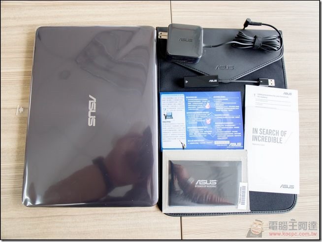 ASUS ZenBook UX305LA 配件包括了筆電本體、外接式網卡、攜行袋、保證書與擦拭布: