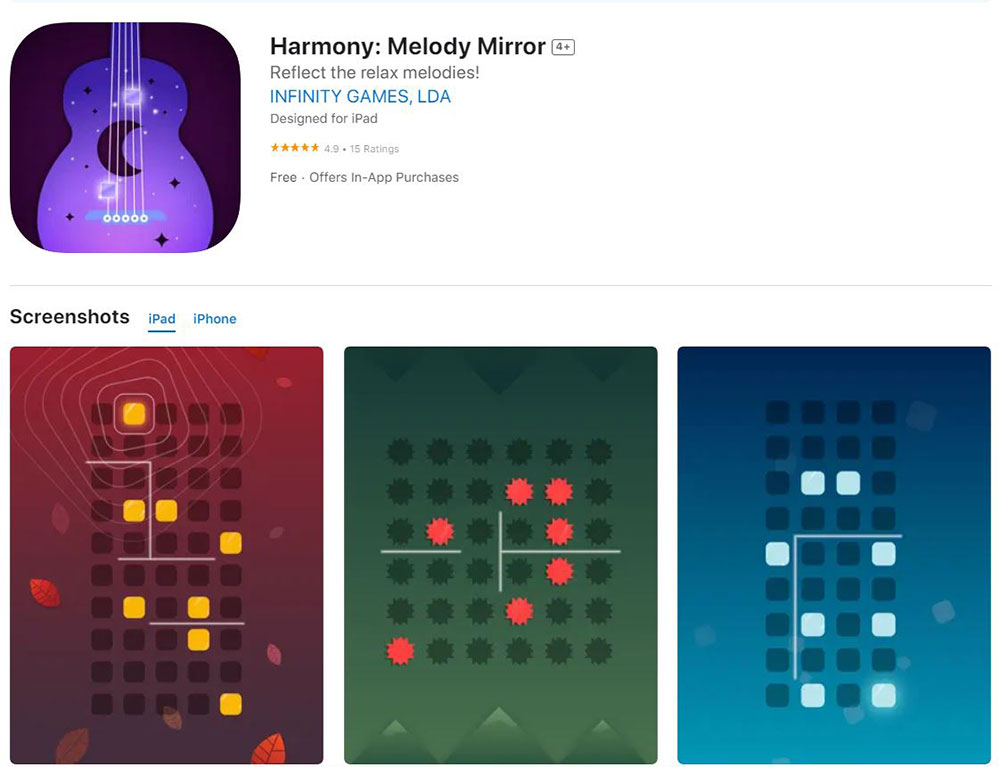 Harmony 是一款透過利用和音音符和對稱模型的力量幫助你放鬆和入睡。它具有簡單直觀的用戶介面,遊戲時點擊螢幕上的方塊,然後鏡像白線上的音符。當你點擊它們時,方塊會亮起並產生和諧的聲音。在應用程式中,你可以選擇不同樂器,例如鋼琴、長笛、吉他等,還有不同級別的難度,使遊戲更具吸引力。