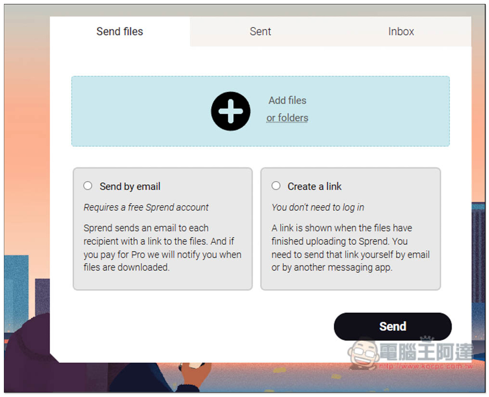 點擊上方連結進到 Sprend 網站後,就可以把你要分享的檔案或資料夾拖曳進來,也能點擊 + 符號來手動選擇。而分享方式有兩種,「Send by email」和「Create a link」,Send by email 需要註冊才能使用,Create a link 則不需要,就看你的需求: