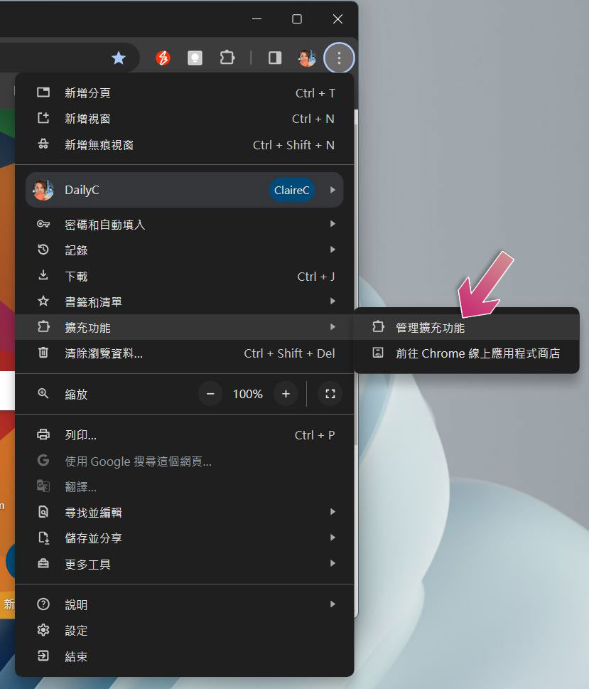 - 點擊 Chrome 瀏覽器右上角的三點選單,將滑鼠游標停在「擴充功能」,並點擊「管理擴充功能」。