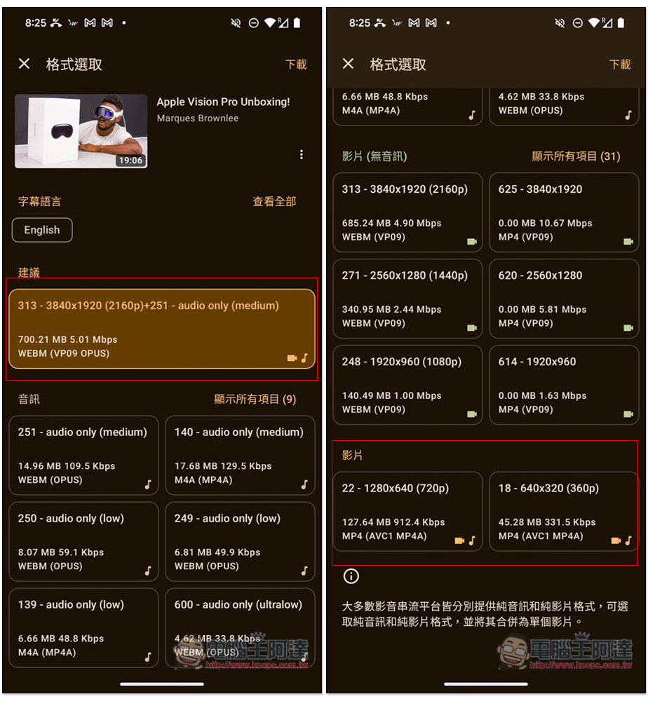 如下圖所示,最上方建議是 App 找到最好的解析度和音質,不會是 MP4 格式,像 YouTube 部分是 WEBM,這部影片最高有 4K 解析度。如果要下載 MP4,滑到最下方的影片欄位即可找到載點,不過最高解析度只有 720p。每一個格式都會標示檔案大小,這我蠻喜歡的:
