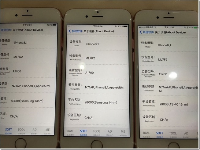 中國網友200zjf在百度貼吧張貼一系列的iPhone 6s續航力測試照片,照片中他拿兩臺Samsung 14奈米A9處理器的iPhone 6s 16G,以及一台台積電16奈米A9處理器的iPhone 6s 16G,兩台都充飽至100%電力,然後在「螢幕亮度調到最低」、「關閉所有後台程式」、「開啟飛航模式」的狀態下來比較耗電速度。下圖的左邊與中間的手機,都是Samsung 14奈米A9處理器的iPhone 6s 16G,右邊是台積電16奈米A9處理器的iPhone 6s 16G。