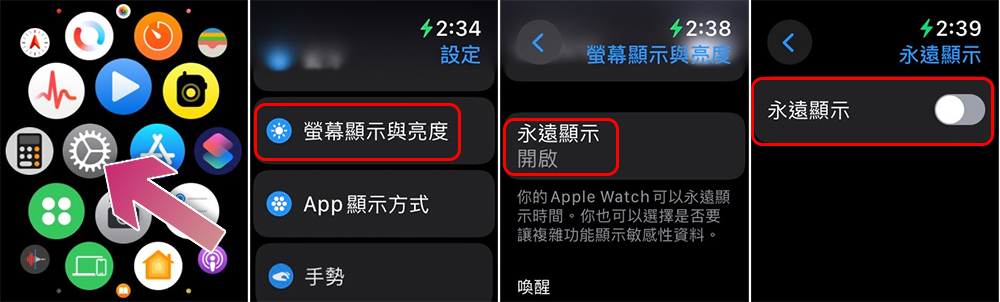 Apple Watch,在 Series 5 之前,抬起手錶看時間或使用它時才會點亮螢幕。 但自 Series 5 以後,所有 Apple Watch(SE 除外)都配備了 AOD 功能,即使你不看手錶,錶盤也會保持亮起狀態。它會大幅調暗顯示器以節省電池,但仍需要電力來維持螢幕開啟。雖然它預設為開啟狀態,但你可以在「設定」中的「螢幕顯示與亮度」面板中,向下捲動你會找到「永遠顯示」選項,點擊進入關閉它可以延長電池續航。