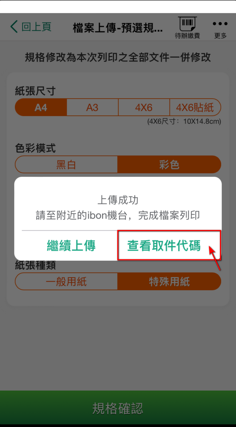 點擊「預選規格」,如果使用的是上面提供的紅包袋模板的話,規格選擇 ” A4 “、” 彩色 “、” 單面列印 “、” 特殊用紙 “,選擇完之後點擊「規格確認」並選擇確認上傳。照著設定規格印出來的紅包袋才會是較厚且放得下千元紙鈔的大小。(選擇 ” 預選規格 ” 這樣去 ibon 列印的時候也不會發生選錯規格的問題。)