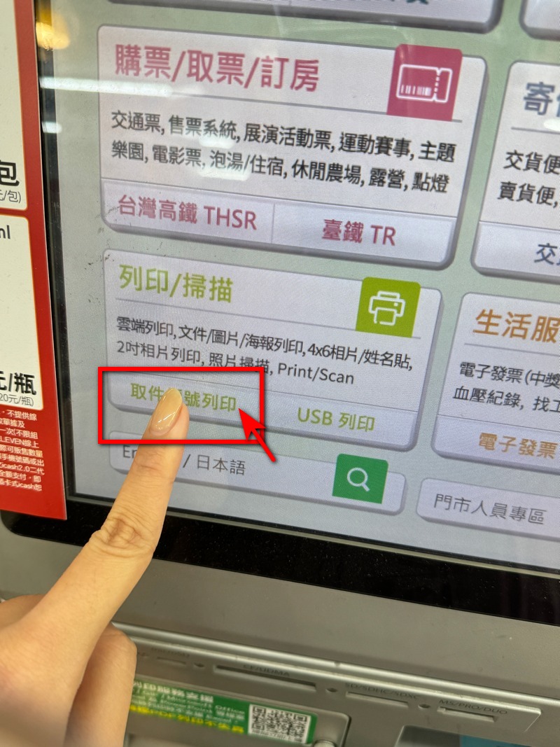 到家中附近的 7-11 找到 ibon 機台,找到列印/掃描的那格,點擊「取件編號列印」,選擇「條碼掃描」,接著會請你顯示 QRCORD 讓機台掃描。