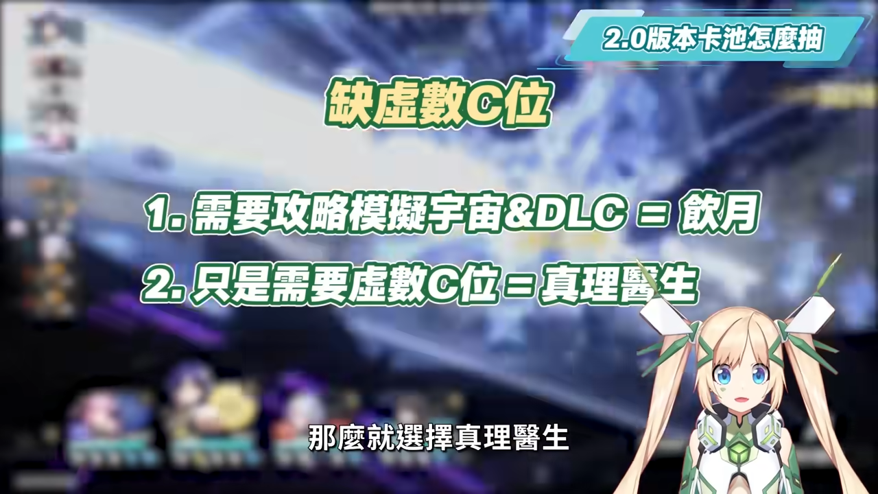 那如果你只是單純站在一個「需要虛數C位」的角度上的話,又沒有足夠的星瓊能夠將飲月抽到星魂2,或是有抱著等他復刻後也要抽到星魂2的決心的話,真理醫生其實也是一個不錯的虛數C位了,而且還是人人都有,光錐也可以找到下位替代。所以再從虛數C位的角度來看的話,若是想要抽一個能很好攻略模擬宇宙高難關卡的輸出角色,那麼飲月就是你的答案,而若是單純缺一個虛數C位,並且也沒有足夠決心和耐心能夠把飲月抽到星魂2,那麼就選擇真理醫生來應付有虛數弱點的敵人就好。