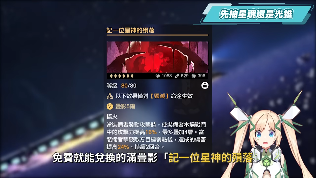 那如果你已經有了一隻飲月後,接下來該往星魂抽還是光錐呢?前面也已經說了飲月的質變、所有五星角色裡面最強的星魂2,都大大體現了星魂2的價值,因此不要懷疑,直接就先以星魂2為一個目標吧!即便還沒有辦法抽專屬光錐,也都可以先用黑塔商店裡面免費就能兌換的滿疊影「記一位星神的殞落」,若是不小心歪到了克拉拉的毀滅光錐「無可取代的東西」也算是能用,看哪個疊影數高就能先用,其他五星限定毀滅光錐也都有提供基本的高攻擊數值或是雙暴,就算效果可能吃不滿也都能在沒專屬光錐時先用,像是刃的光錐「到不了的彼岸」或是鏡流的光錐「此身為劍」,四星毀滅光錐能考慮的也有「祕密誓心」、「在藍天下」、「鼴鼠黨歡迎你」,因為飲月本身就比較容易吃到多種BUFF乘區,所以在光錐的選擇上空間也比較大。