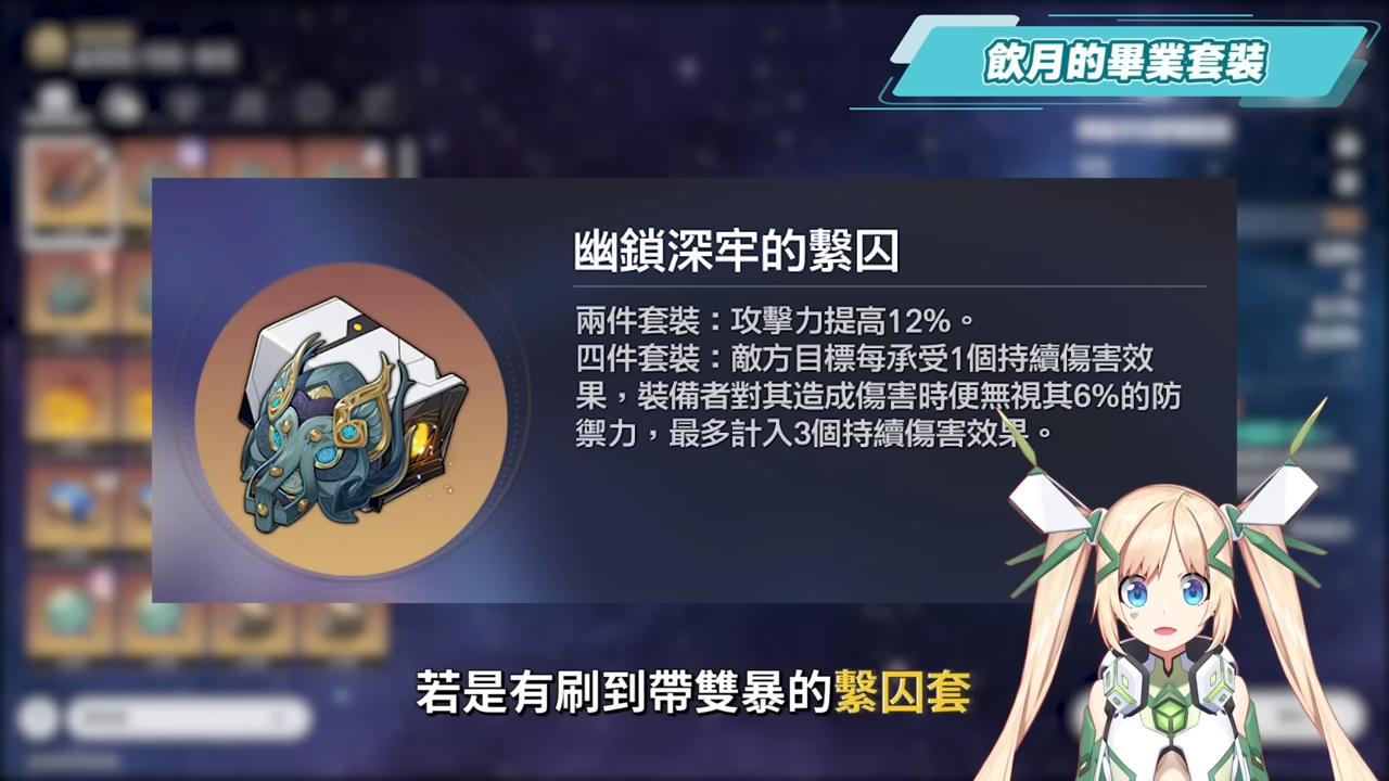 飲月的畢業套裝主要還是攻擊+虛數傷害的2+2,攻擊的2件套除了快槍手之外,由於在這段期間新增了繫囚套,所以剛好在刷繫囚套的同時,若是有刷到帶雙暴的繫囚套,也正好可以有機會刷出飲月可用的2件套,而另外2件套同樣選擇廢土客,以2+2來說最好畢業,傷害也不差,而飾品2件套則最好是繁星競技場,只是暴率需要堆到70%,假如沒有抽專屬光錐或是使用一些五星限定光錐,可能會稍微比較難達到。