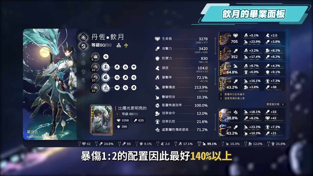 這邊也分享關於飲月的畢業面板參考,暴率最好是70%以上,正好搭配繁星競技場,暴傷1:2的配置因此最好140%以上,通常有抽專屬光錐的話就有機會能穿暴傷衣,暴傷也會有機會到200%左右,攻擊力大約會落在3000~3600,主要注意攻擊力和雙暴的配比就差不多了,主屬性的配置主要是雙暴軀幹、攻擊鞋、虛數大於攻擊球、攻擊繩為主。