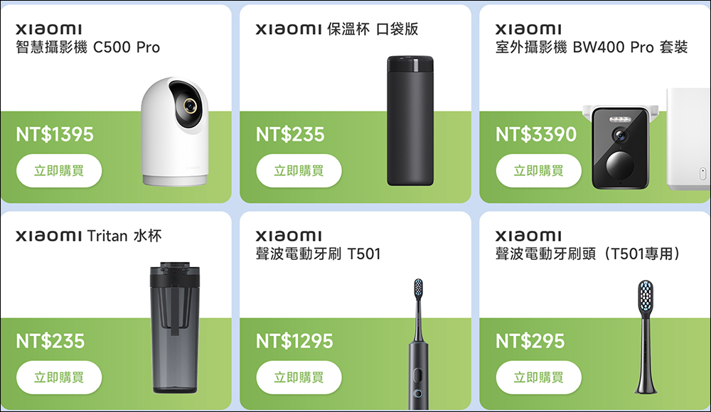 | Xiaomi 室外攝影機 標準版 | NT$645 | NT$350 |