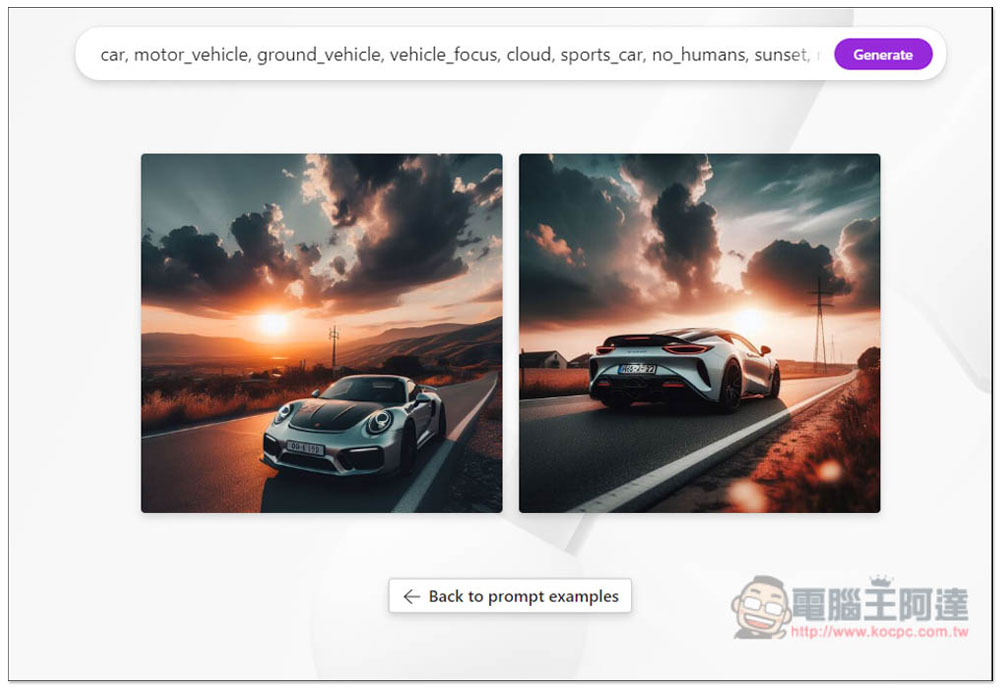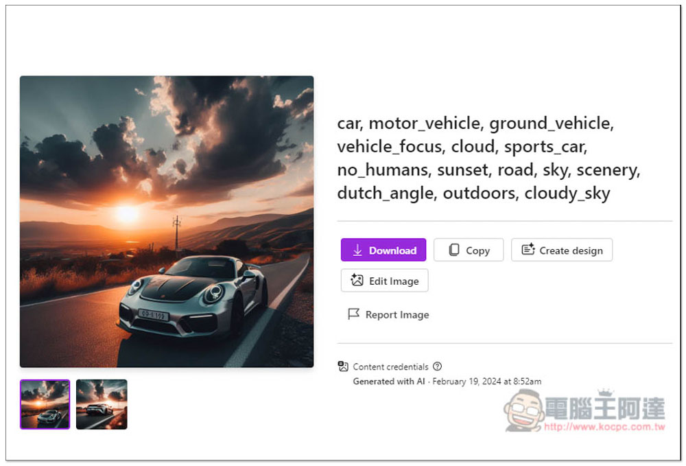 輸入中文、英文等語言都可以,我創建一個有關於跑車的圖片: