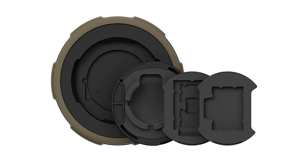 PolarPro Defender 相機防丟神器將相機基本上必備的鏡頭蓋甚至是機身蓋全都加入了可以隱藏安裝 AirTag 的設計 – 真的是隱藏式設計,從外觀上看來就是個很有軍事風格的相機配件而已,實際上解鎖扣具旋開內圈的模組之後,就可以看到可以藏入 AirTag 防丟器的隱藏設計在其中。