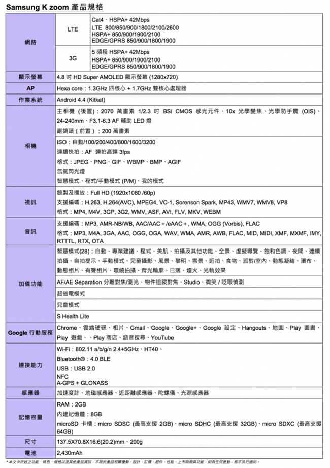 以產品調性來說「Samsung GALAXY K zoom」在鏡頭規格上比不上單眼,在手機硬體規格上比不上旗艦機,但是他蠻成功的將人們需要「一台拍照還不錯的DC」與「效能規格不錯的中高階智慧手機」融合在一起,讓消費者可以用 16900元(建議售價)去買到一台擁有12~15000等級的全功能 4G LTE 手機與 6~7000 元相機(K zoom感光元件規格接近 Samsung WB350F)的合體,而且最方便的是你只要帶一台裝置出門就可以滿足兩種需求。當然 K zoom 也不是完美的,比如說機身的厚度初期需要時間適應、喇叭有點小聲(與S5相比)、台哥大與遠傳的 700 MHz 4G不能使用,而且沒有LED 補光燈能當手電筒(笑)。