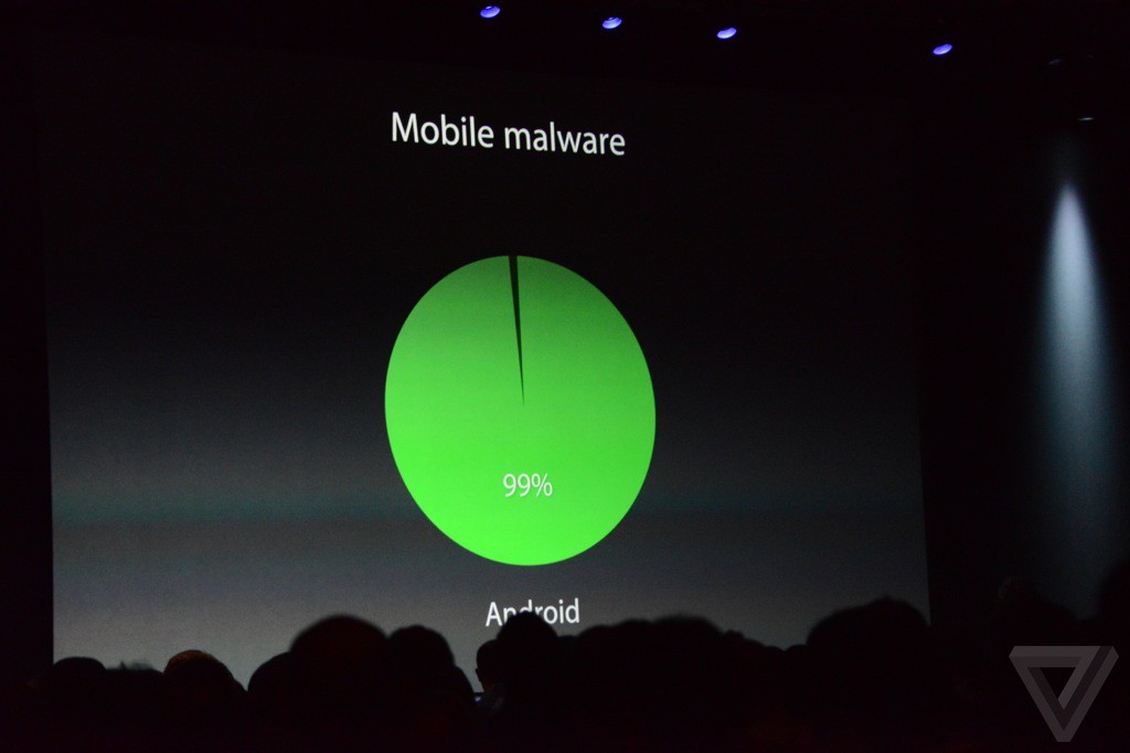 繼續由庫克介紹 iOS8,一開始他又酸了一下 Android 平台,他說 99% 行動裝置的惡意程式都是來自 Android(這是事實,所以 Android才有防毒軟體):