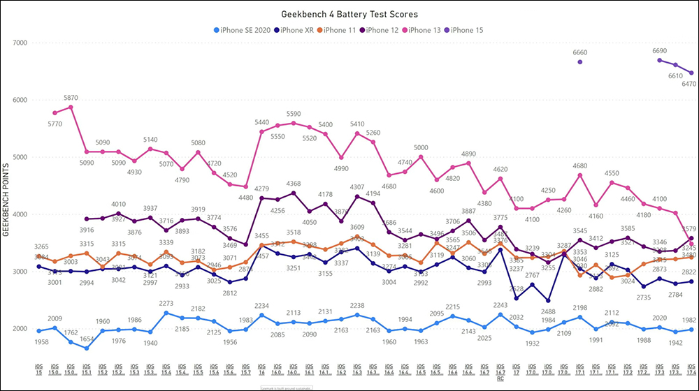 Geekbench 4 電池測試的分數如下, iPhone SE(2020)為 1,982 分(iOS 17.3 為 2,020 分)、iPhone XR 為 2,822 分(iOS 17.3 為 2,873 分)、iPhone 11 為 3,245 分(iOS 17.3 為 3,346 分)、iPhone 12 為 3,579 分(iOS 17.3 為 3,208 分)、iPhone 13 為 3,480 分(iOS 17.3 為 4,100 分),新加入的 iPhone 15 則為 6,470 分(iOS 17.3 為 6,610 分)。