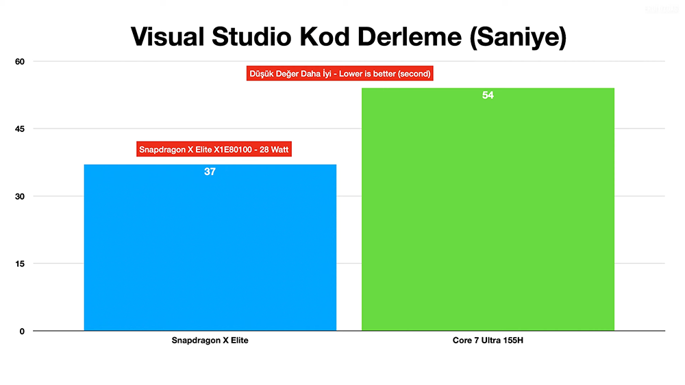 Visual Studio Kod Derleme(Saniya)測試中,Snapdragon X Elite 也更快,37 秒就完成,Intel Core Ultra 7 則要 54 秒,代表說高通快了 45%。Erdi Özüağ 補充說有這樣的差距,有可能是因為 Snapdragon X Elite 記憶體時賣比較高的關係: