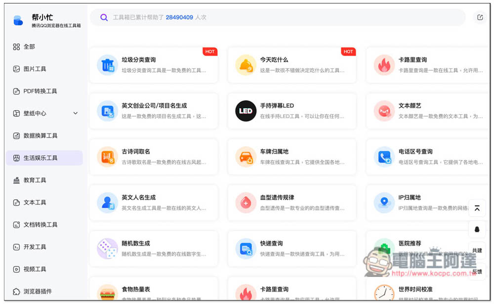 這款「幫小忙」線上工具是由騰訊 QQ 所推出的,點擊上方連結進到網站後,右側是所有工具列表,左側則是完整分類,有圖片工具、PDF 轉換工具、壁紙中心、數據換算工具、生活娛樂工具、教育工具、文本工具、文檔轉換工具、開發工具、視頻工具、以及瀏覽器插件等,我大致算一下至少超過 100 個工具:
