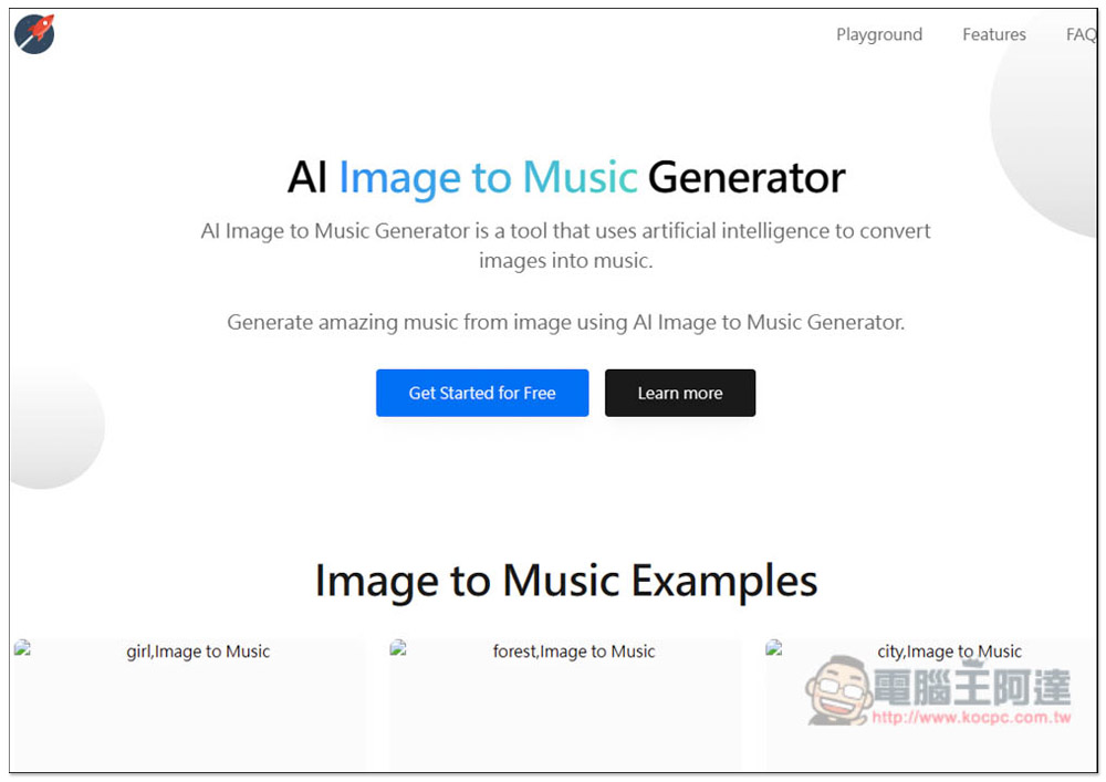 Image to Music 是一款免費工具,點擊上方連結進到網站後,按 Get Started for Free 就能開始使用,沒有圖片數量限制,你要轉換幾張都沒問題: