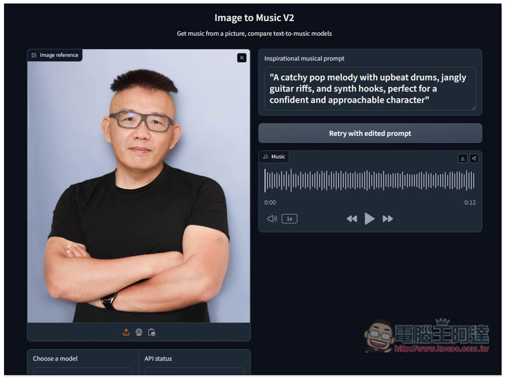 完成後,上方會顯示它所使用的 Prompt,阿達這張照片它判斷成「一首朗朗上口的流行旋律,搭配輕快的鼓點、清脆的吉他 Riff 和合成器鉤子,非常適合一個自信且平易近人的角色」,按下方的播放鍵就能聆聽建立好的 AI 音樂: