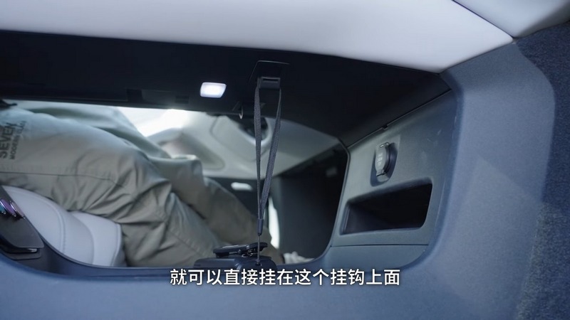 小米 SU7 在收納方面也有用心,前座有一個儲物槽,儲物槽有兩個隱藏掛勾,可以拿來掛東西。儲物槽還有一個可以變成行動電源、破窗器的萬能手電筒。