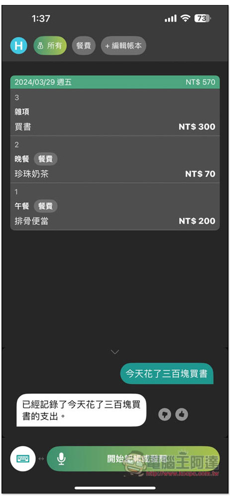 以上這些都需要靠嘴巴說就能做到,不過帳本部分就必須手動建立了,目前 AI 還不支援。另外如果不方便說,它也提供鍵盤輸入功能,但也是透過 AI 聊天的方式,沒辦法手動建立花費。