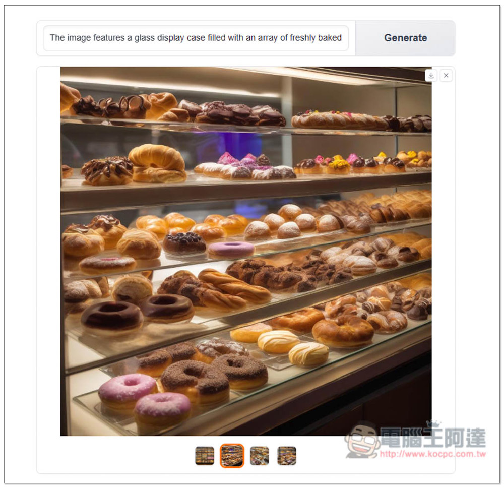 完成後就會出現 4 張結果。雖然生成速度很快,但每一張的品質都很不錯,且符合我 Prompt 中要求的甜甜圈在展示櫃裡面: