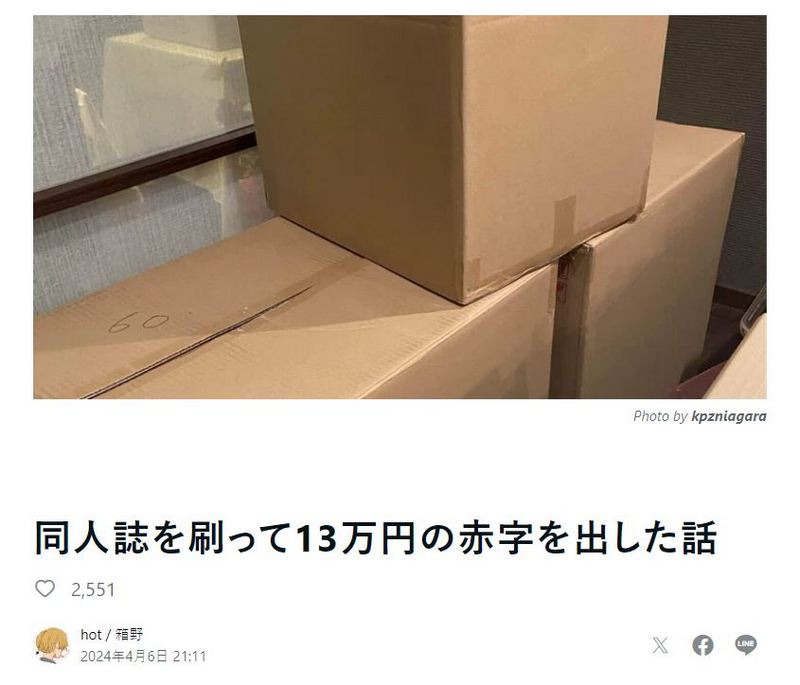 日本網友 hot / 箱野在日本創作平台 note 上發布「印刷同人誌,虧損13萬日圓的故事」的文章,文章中她提到她寫了一本無法預估需求量的評論同人誌書籍,因為評論同人誌不是漫畫、小說也不是延伸作品,主要的內容是檢視作品中呈現的訊息、閱讀的脈絡、環境解讀、讀者對於訊息的認知,本身就是小眾賽道所以當她考慮要將其印刷成書時也非常苦惱應該要怎麼做。