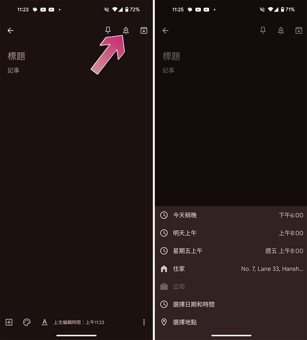 如果你想要在 Google Keep 中建立提醒,只需要在建立筆記時點擊右上角的鈴鐺圖示即可。 Keep 會要求你設定提醒的時間和日期,另外還將提供設定以位置微處的提醒,儘管任務或助理不支援此特定功能。