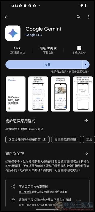 想要在手機端使用 Google Gemini,也相當簡單只要到 Google Play Store 搜尋 Gemini,就能免費安裝使用,第一次使用時系統會詢問是否要用 Gemini 取代 Google 助理,當然是選擇切換(用不慣的話砍掉就恢復了):