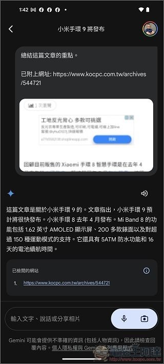 實測大部分的網站都可以檢索內容並得出我們需要的結果,不過我測試了 CNN 之類的網站,發現 Gemini 雖有總結,但會立刻跳出無法讀取內容的訊息(可能是有些考量吧?):