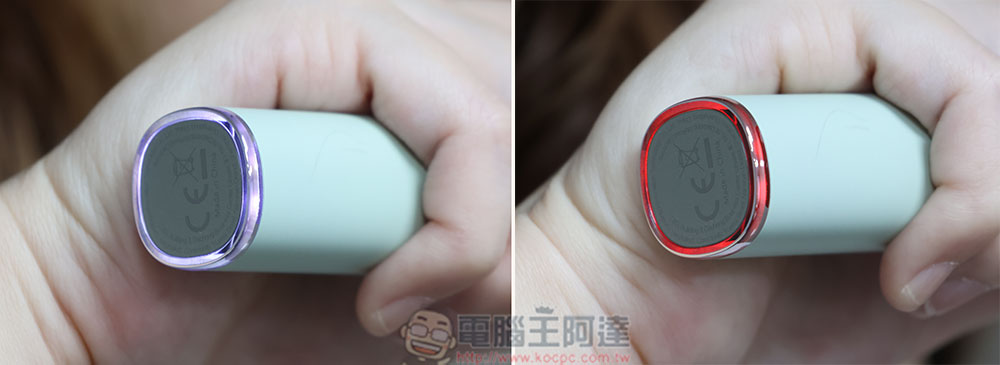 接下來就是我個人最喜歡的功能之一:過壓提醒。對於刷牙要用多大的力道這點,每個人手勁都不一樣,為了讓使用者更直觀地隨時調整力度,在 Oclean X Ultra WiFi 握把底部配置有提醒用的 LED 色燈。當過度施力時會亮起紅光,適當力度回歸紫光,讓你適時地調整刷牙的力道。