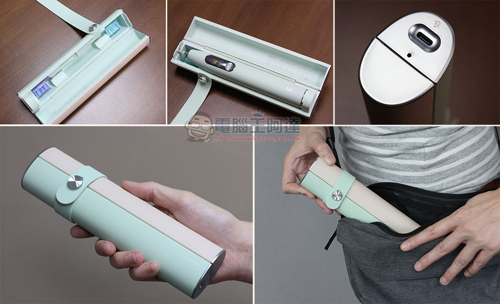 當你想要來趟旅行,或是習慣在中午用餐後在公司刷個牙,一定會希望有更穩妥的方式隨身攜帶電動牙刷。隨盒附上皮革風高質感同色旅行充電盒,旅行充電盒中配有兩個收納刷頭的位置,可將刷柄與刷頭分開固定;底部配有 USB Type C 充電孔,連接上任意充電器後將牙刷柄放入即可開始充電。
