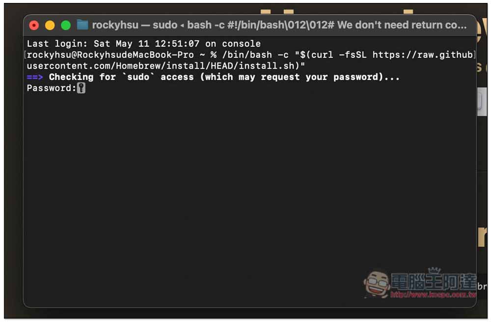 這邊我示範用終端機的安裝流程。打開 Mac 內建的終端機,輸入方這個指令: